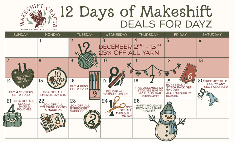 At Makeshift Crafts, we’re all about bringing crafting back to its roots: hands-on, community-focused, and full of heart. Our retail area is stocked with carefully curated craft supplies for yarn crafts, embroidery, paper arts, and more. We also carry unique DIY kits to get you started on a new project, plus locally made gifts and notions you won’t find at big-box stores. We love supporting other small businesses, so browsing around you will discover a wide variety of products from new and upcoming small businesses you may have never heard of before!Â